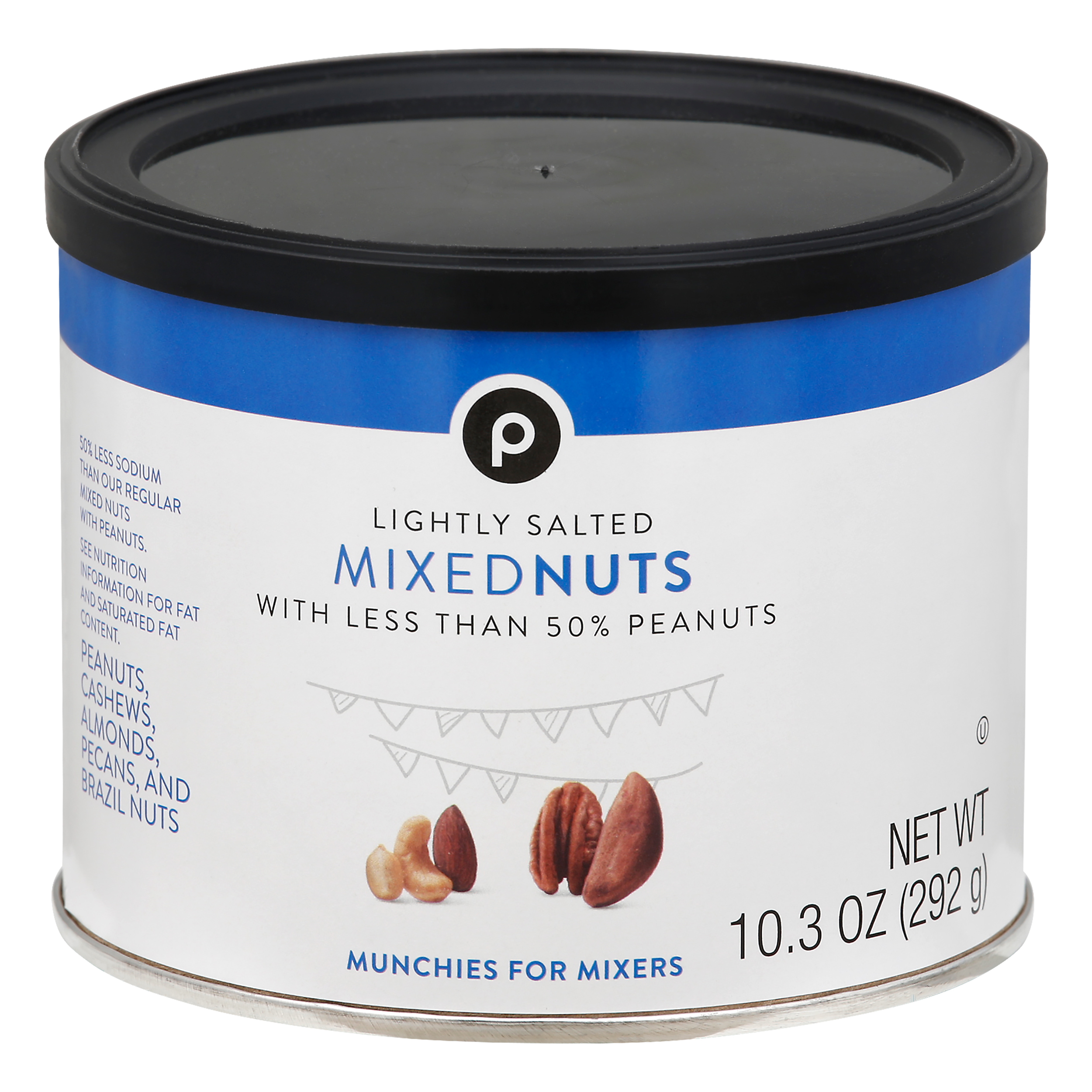 50% less sodium than our regular mixed nuts with peanuts. See nutrition information for fat and saturated fat content. Contains 45 mg sodium per serving compared to 90 mg sodium in our regular mixed nuts with peanuts.